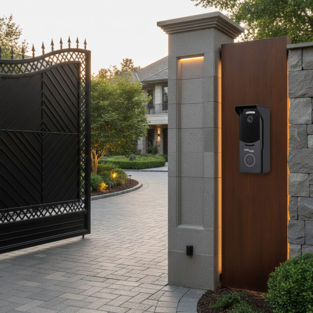 IP Video Doorphone featuring a high-resolution IP door camera with optional facial recognition. The sleek Android-10 wall-mounted indoor tablet supports multiple screens, integrates seamlessly with CCTV systems, and connects with home automation for lighting control. Ideal for luxury villas and expansive premium homes requiring elevated security and convenience.