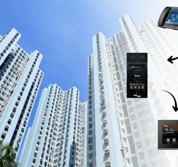An advanced IP-based Video Doorphone platform designed for fully integrated apartment security. It enables centralised management, seamless intercom connectivity, and smart integration with building systems for future-ready living. The 3-tier setup includes a Guard Concierge Phone, Block-wise Lobby Panel, and in-apartment Call Monitor. It integrates with CCTV, RFID access for common amenities, ANPR-based parking management, mobile app access, lobby access control,